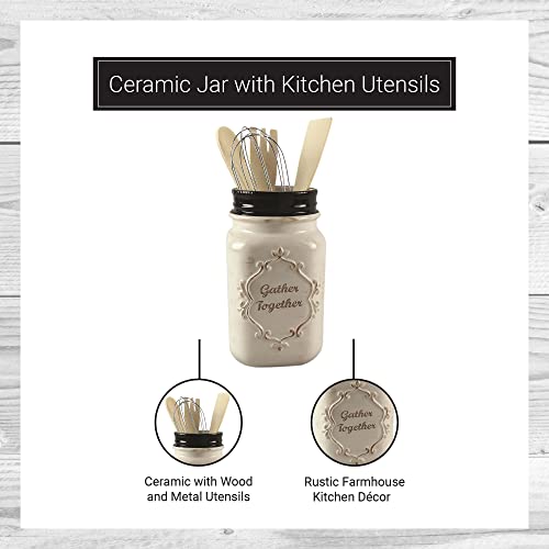 KITCHEN UTENSIL HOLDER: Our multi-colored canister is sure to enliven your stovetop. It features cream and tan hues, complete with a whisk and wooden utensils. The full graphic text is framed with a decorative design and reads 'Gather Together.'